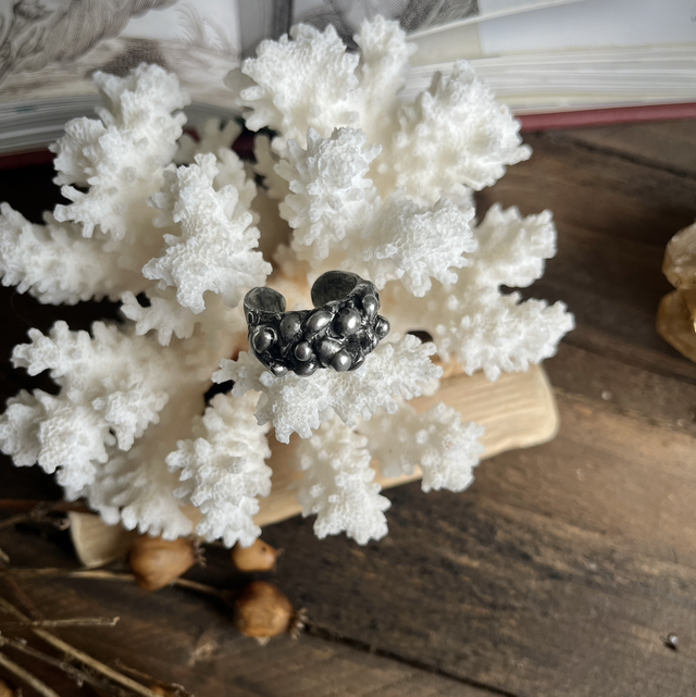 Cette bague organique en cuivre recouverte d’une soudure douce à l’étain sans plomb a été façonnée dans la lenteur et avec soin.