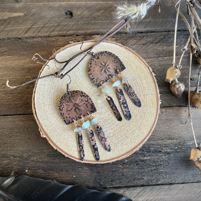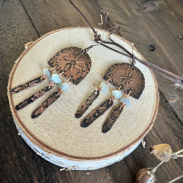 Cette paire de boucle d’oreille faites de cuivre et de perles d’Amazonite est un bijou à la fois doux et puissant, relié à la terre. Chaque boucle capte la lumière, épouse le mouvement et se porte comme un talisman, entre douceur, féminité solaire et présence.