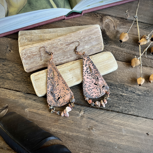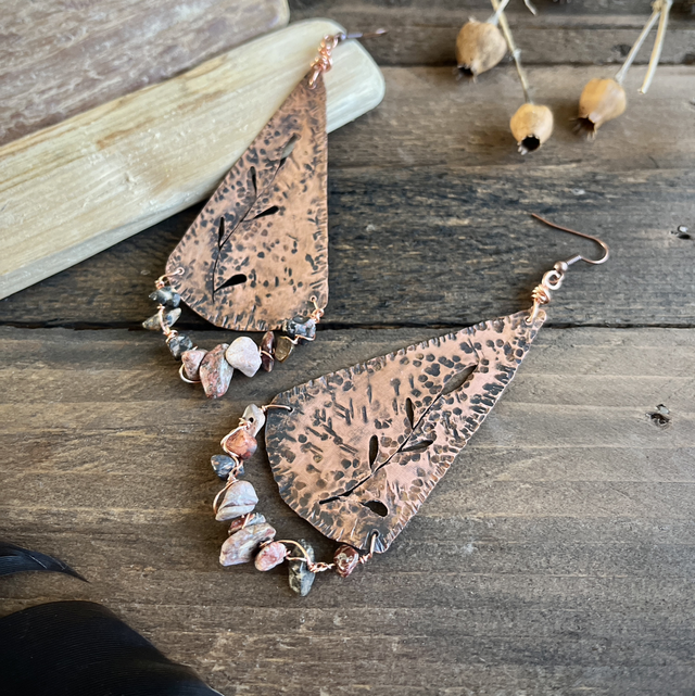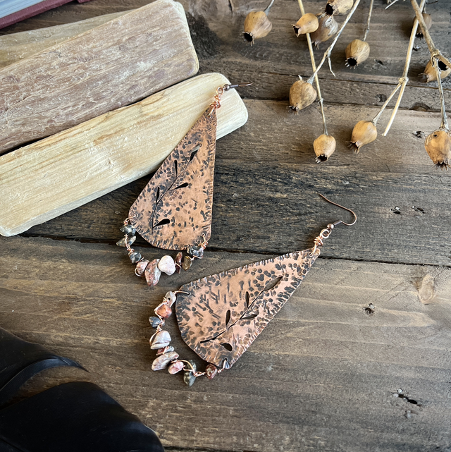 Cette paire de boucle d’oreille faites de cuivre et de perles de jaspe léopard est un bijou à la fois doux et puissant, relié à la terre. Chaque boucle capte la lumière, épouse le mouvement et se porte comme un talisman, entre ancrage, féminité et présence.