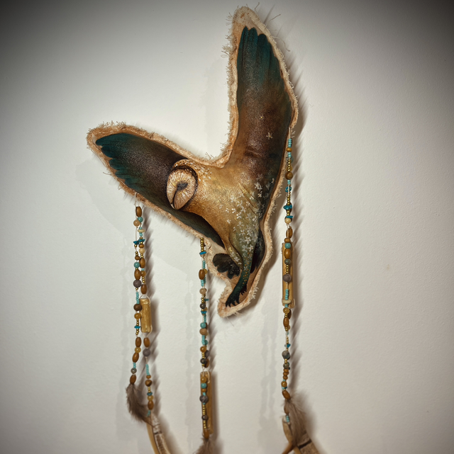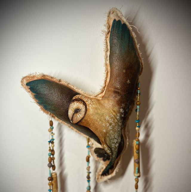 Au coeur de cette oeuvre totémique se trouve une peinture originale de chouette effraie, réalisée sur toile de coton brute.
