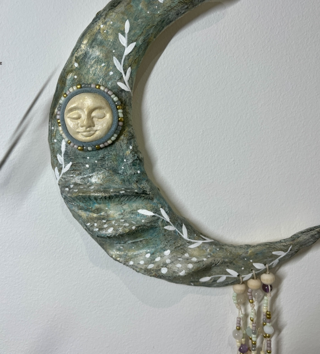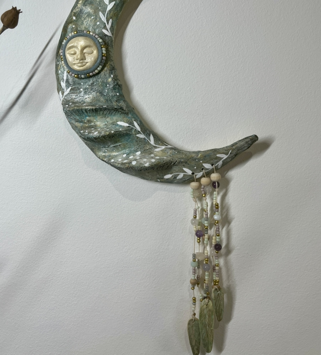 Fabriquée à partir de carton de récupération, de papier mâché et d’argile auto durcissante, peinte à la main avec de la peinture acrylique et vernis, et ornée de perles d’améthystes, de cristal de roche et autres perles fantaisie et plumes faites mains en porcelaine froide, elles sont à accrocher au grès de nos envies, là où notre cœur nous conduit à l’introspection.