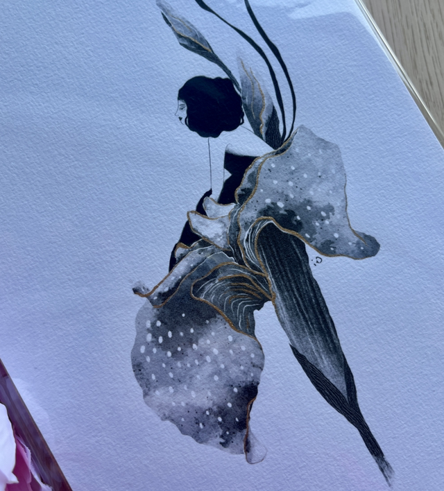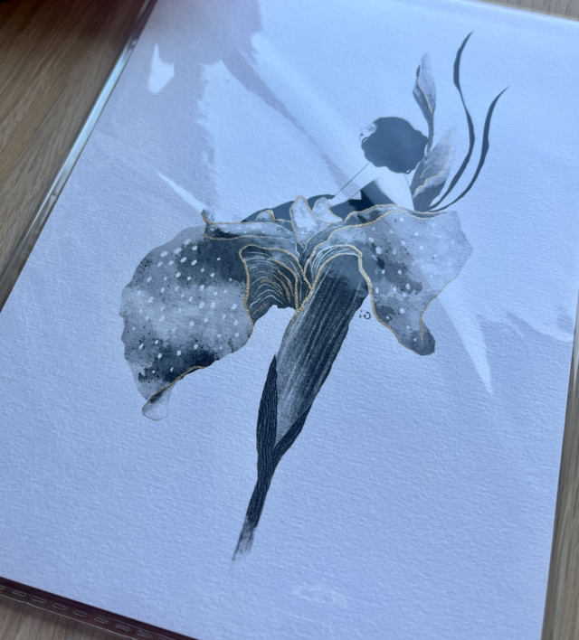 Illustration digitale imprimée sur papier à grain rehaussée à la main avec de la peinture acrylique noire et dorée